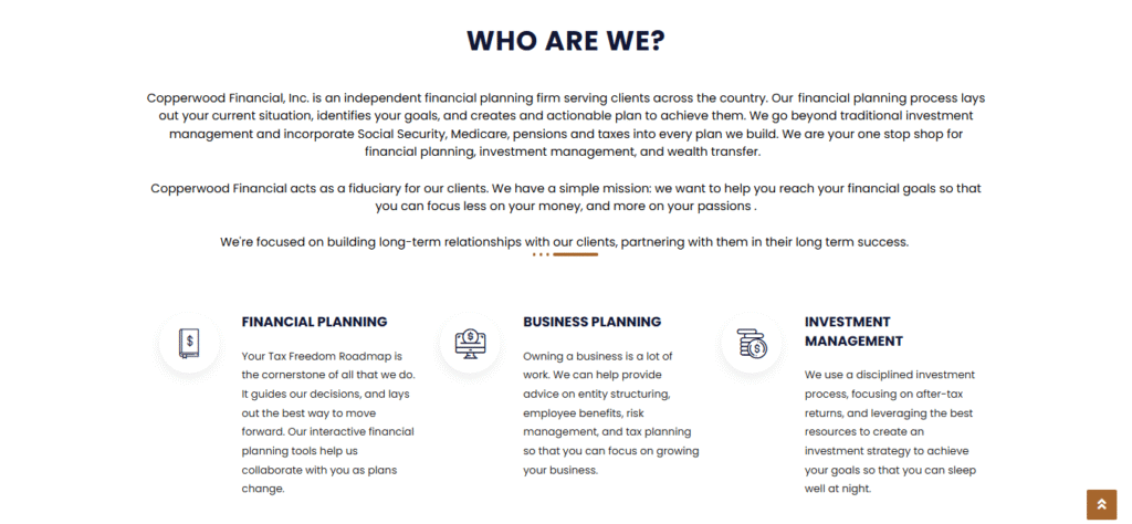 As a fiduciary firm, Copperwood Financial adheres to strict ethical standards and regulatory requirements. The website clearly communicates the firm’s fiduciary commitment, helping build confidence among potential clients who value transparency and trust.